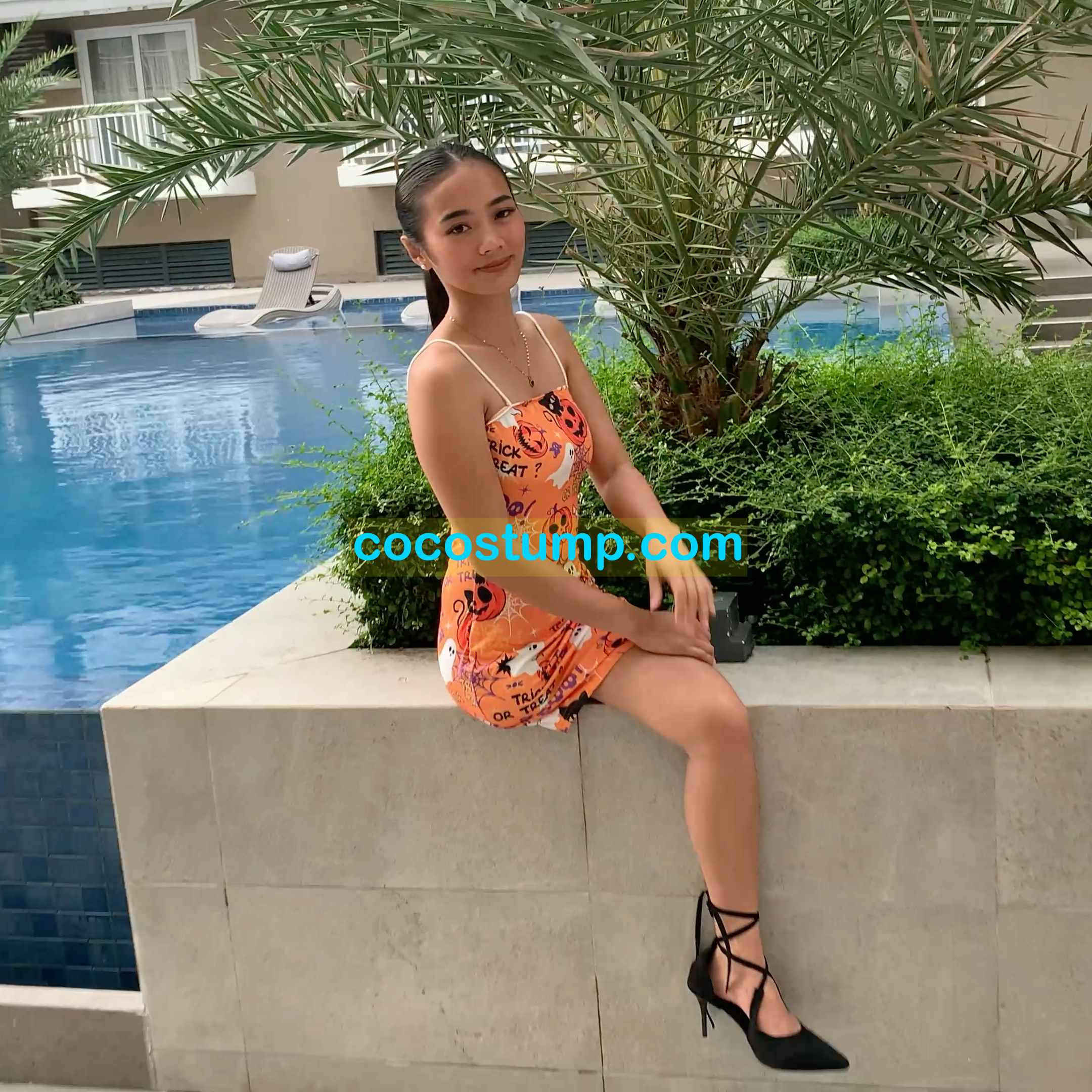 Cathy black heel & orange mini dress 4k